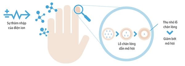 - Phương pháp này hoạt động bằng cách hướng một dòng điện nhẹ qua da qua nước, vô hiệu hóa kết nối giữa các dây thần kinh và tuyến mồ hôi giúp điều trị chứng bệnh tăng tiết mồ hôi quá mức.