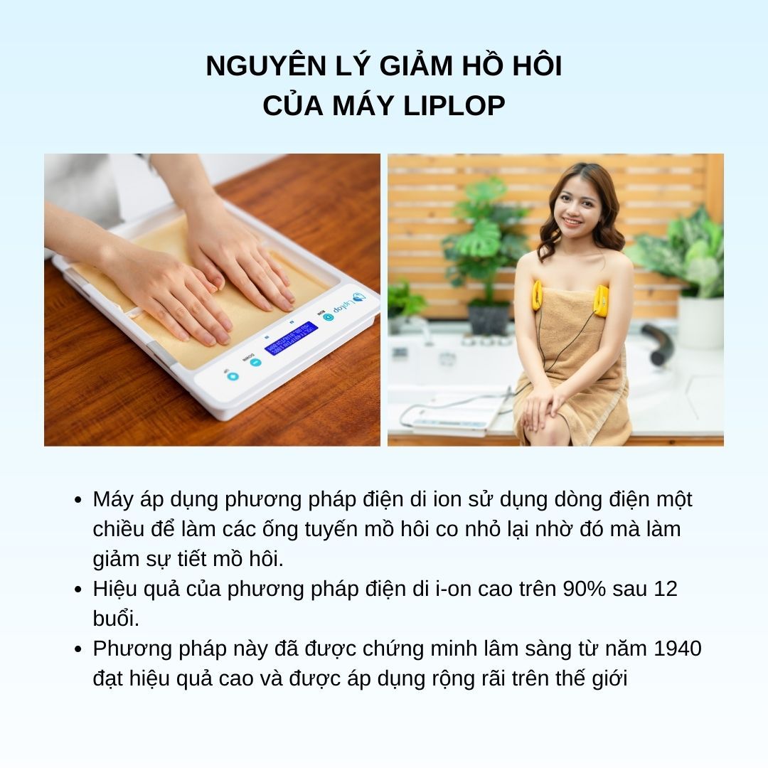Máy điều trị mồ hôi Liplop áp dụng phương pháp Ionophorese (điện ion), đây được coi là phương pháp tiên tiến nhất hiện nay có hiệu quả và an toàn, không có tác dụng phụ, không rủi ro cho sức khỏe và được giới Y khoa đặc, biệt là các bệnh viện trong nước sử dụng cho bệnh nhân mắc chứng bệnh tăng tiết mồ hôi